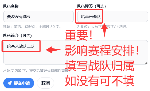 【必看】本系统使用指南 作者:系统 发布时间:2026-01-17 21:54 浏览:181 更新:2026-01-18 11:59 本系统仅用【QQ邮箱】进行账号认证 你的【QQ邮箱】即为QQ号+后缀@qq.com(例:475407353@qq.com即为一个QQ邮箱)领队注册队伍时可自定义队伍名 但若同一组织有多个队伍请务必在队伍标签处写上统一称号(如图)队伍如有赛程领队和队员可通过右下角闪电快捷栏点击【我的赛程】查看赛程安排以及对方领队联系方式 如需协调赛程时间请双方协商一致后将【包含协商结果的截图】发送至475407353@qq.com 后台将修改系统赛程时间